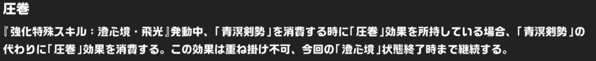 *1:「圧巻」を所持している場合、【飛光】発動時に青溟剣勢の代わりに「圧巻」を消費。無凸では重ねがけ不可だが、2凸すると上限が9重になる。