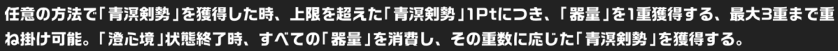 「器量」はいわゆる、澄心境の“予備燃料”。通常、青溟剣勢は6Ptまでしか貯まらないが、超過した分が「器量」としてストックされます。